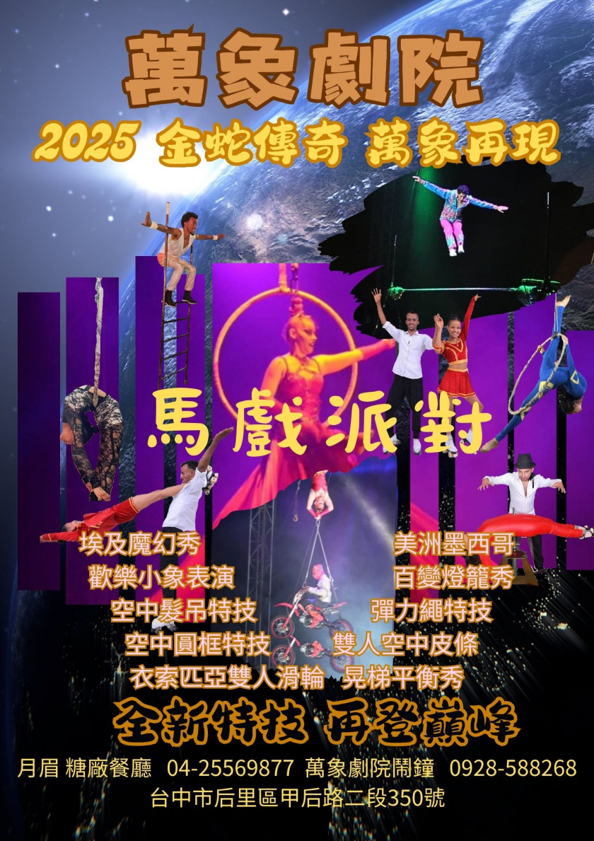 來自世界各國特技表演頂尖人員,帶著獨特的人文風情, 來到台灣展現世界風情特色,令人嘖嘖稱奇的神秘魔法, 讓遊客嘆為觀止的特技演出,神秘又有特色的民族風華。 全部都在萬象劇院一次到位,讓你大開眼界瘋狂上演。