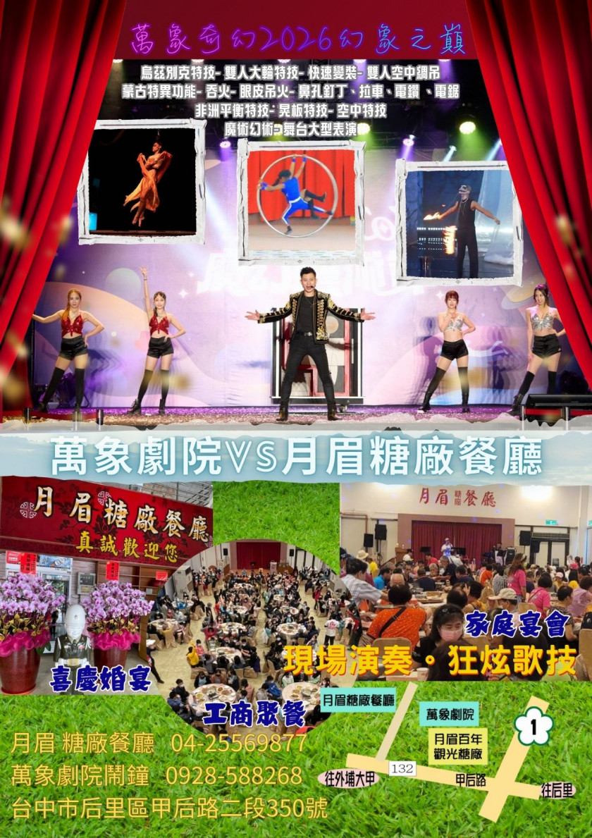月眉觀光糖廠新公告 號外號外~~ 萬象劇場頂尖團隊進駐月眉糖廠餐廳 全新經營團隊~頂尖星級廚師 生活與美食之間的連結 宅在家也要美食饗宴 即日起電話預訂餐點外帶 支持防疫~ 免動手、免開伙、免洗碗 在家吃就是這樣簡單 歡迎公司團體訂購,如需外送可先來電告知哦! 訂餐專線04-25569877 取餐地址:台中市后里區甲后路二段350號 Ps防疫期間,請大家口罩戴好,勤洗手 保護自己,也保護他人